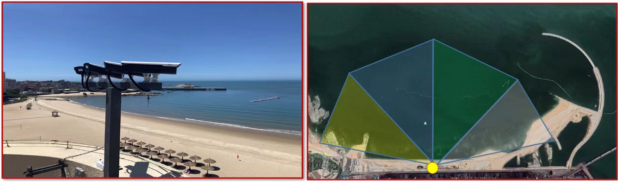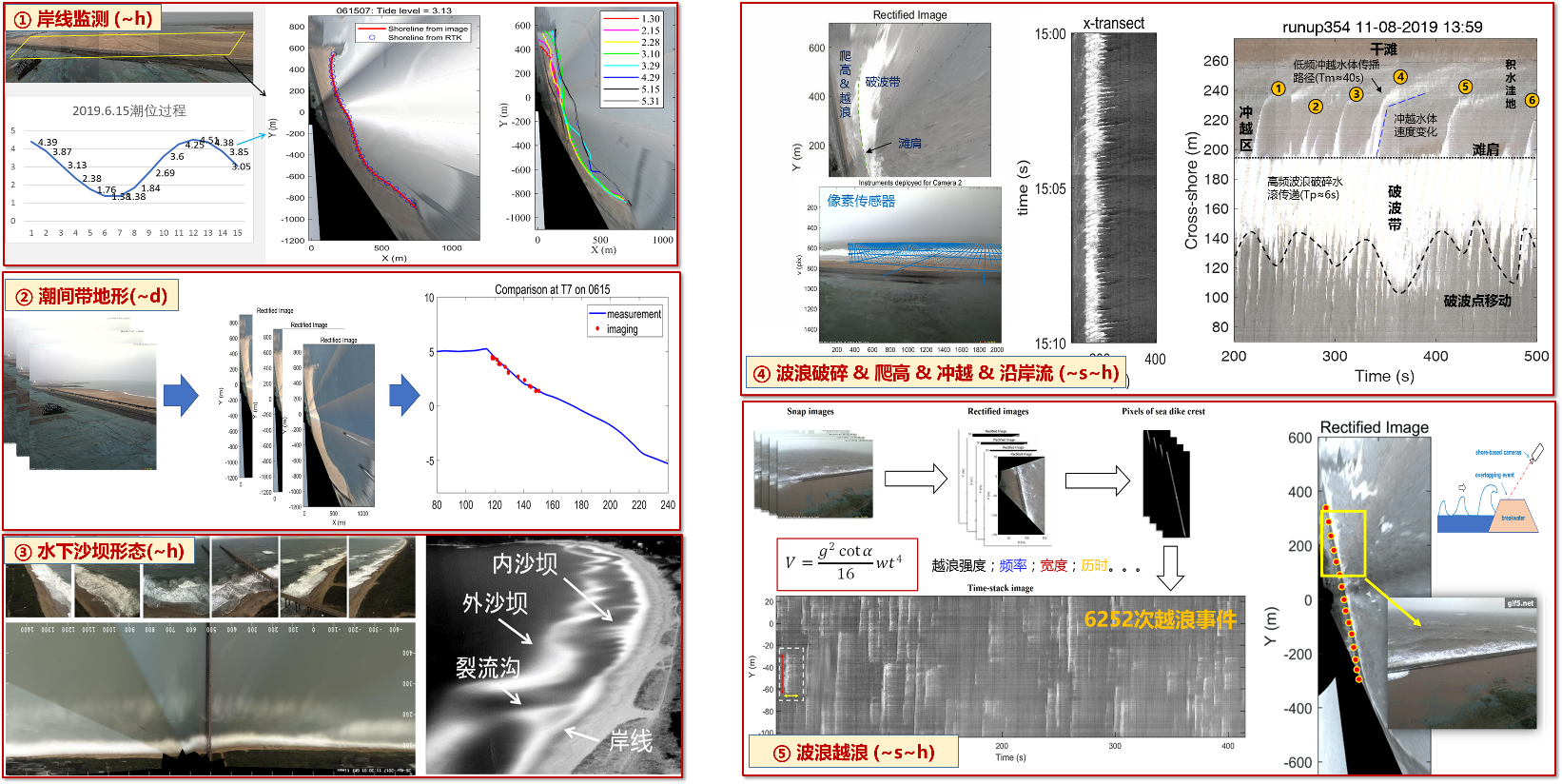 SEX8 自主研发了新型海岸带岸基数字影像监测系统(COSVIMS),基于数字视频监控技术、影像分析技术和信号处理技术,以指定的时间表和2Hz以上的采样率,对空间范围1km以上的岸滩区域进行实时连续的数字影像和光学传感数据采集,可实时定量解析岸线位置、潮间带地形、沙坝形态、波浪破碎爬高越浪、水深反演、植被分布、人类活动轨迹等数据,空间分辨率可达cm~m,时间分辨率可达s~hr,实现了全天候、长期、连续、实时的海岸动力地貌和环境数据的准确监测。