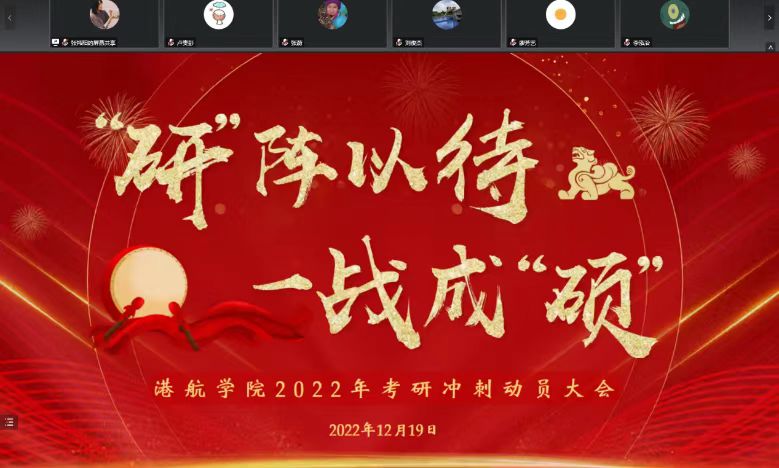 22年12月19日下午,SEX8 2019级考研学生在线上举办“研阵以待,一战成硕”考研冲刺动员大会,SEX8 张蔚副院长、2019级班导师、辅导员出席了会议。