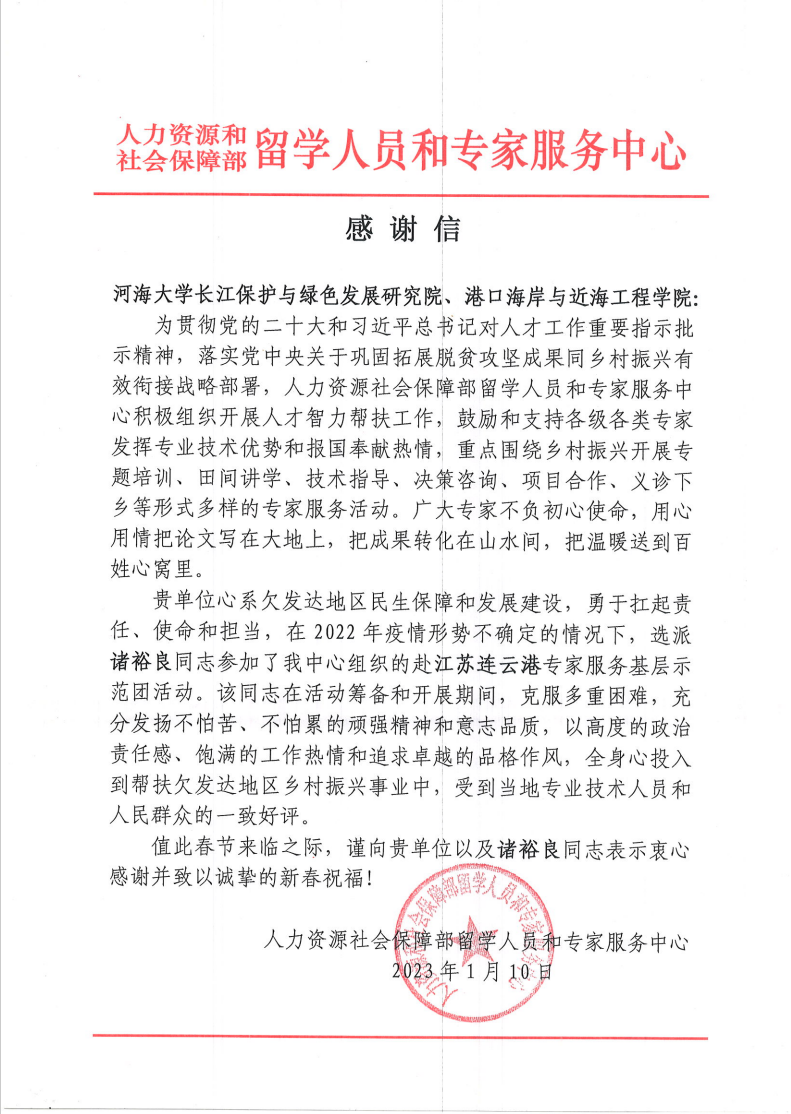 2022年10月,应人力资源和社会保障部留学人员和专家服务中心的邀请,SEX8 选派诸裕良教授参加了该中心组织的赴连云港专家服务基层示范团。近日,SEX8 收到了该中心发来的感谢信,感谢学院心系欠发达地区民生保障和发展建设,勇于扛起责任、使命和担当,高度赞扬诸裕良教授在赴连云港服务期间,克服困难,发扬不怕苦、不怕累的顽强精神和意志品质,全身心的投入到帮扶欠发达地区乡村振兴事业中,受到了当地专业技术人员和群众的一致好评。