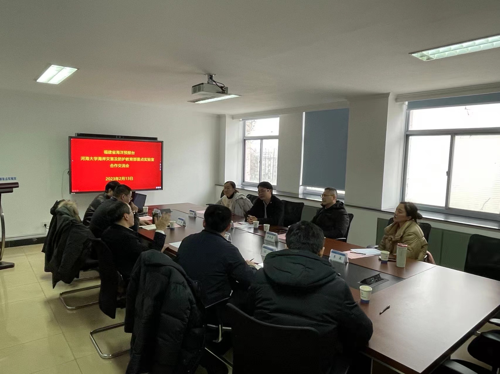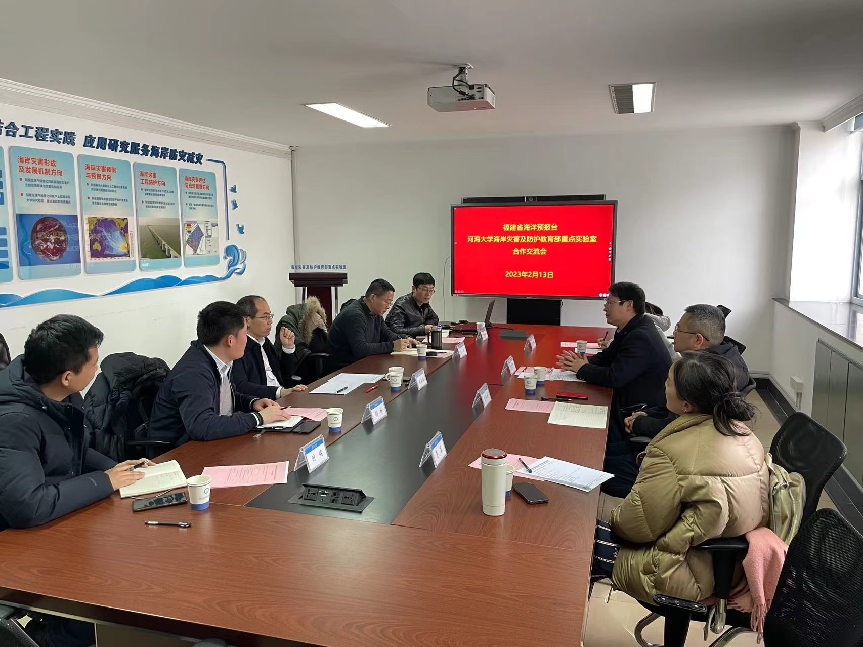 2023年2月13日,福建省海洋预报台曾银东副台长、李雪丁副台长、朱本璐高工和李星高工一行来SEX8 访问交流,洽谈了与海岸灾害及防护教育部重点实验室的合作事宜。会议由校科技处孙林副处长主持,在严恺馆404会议室举行。郑金海副校长致辞并作总结发言。SEX8 孔俊教授、陶爱峰教授、时健副教授参加了会议。