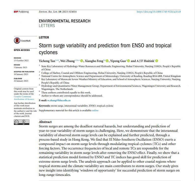 近日,SEX8 张蔚教授和英国雷丁大学冯向波研究员以及荷兰瓦格宁根大学Hoitink教授联合指导的2020级博士研究生谭易成在国际权威学术期刊ERL(Environmental Research Letters)(JCR一区,影响因子6.94)上发表了题为“Storm surge variability and prediction from ENSO and tropical cyclones”的学术论文。该研究成果得到了国家重点研发计划“粤港澳大湾区衍生复合灾害评估与应急避险关键技术”的资助,是张蔚教授研究团队近3年来在河口海岸防洪减灾方向发表的又一重要学术进展,为后续展开海陆交互“多碰头”情况下复合洪水灾害研究提供了基础。