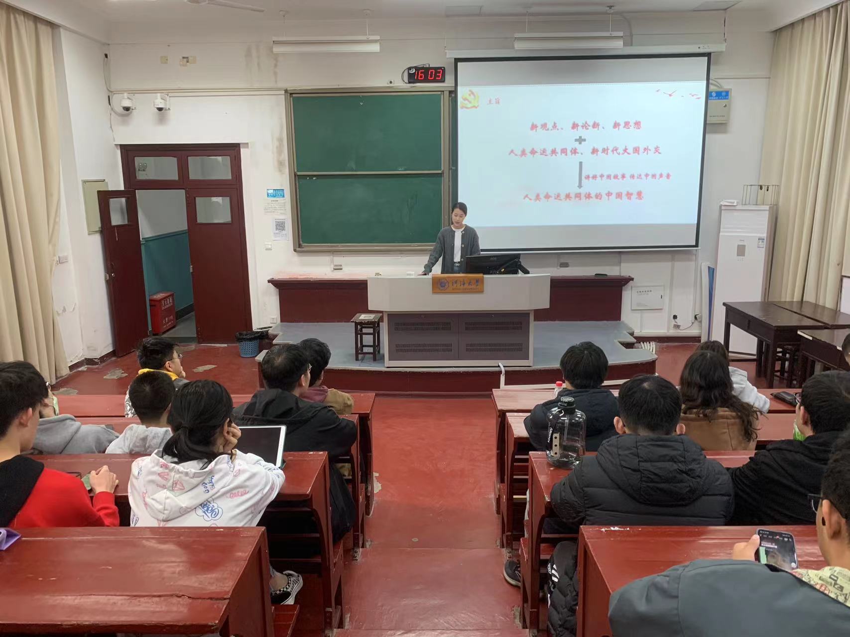 张恩硕从“九个数字”带领学生梳理了党的二十大报告,立足党的二十大报告,详细讲述了构建人类命运共同体重要理念的诞生及发展过程,十年来,构建人类命运共同体从理念转化为行动、从愿景转变为现实。针对如何正确理解和阐释人类命运共同体这一理念,她介绍了全球安全倡议、全球发展倡议、全人类共同价值的“三全引领”理论根基,并从经济、政治、文化、医疗、生态五个层面结合实际案例讲述了推动构建人类命运共同体的具体实践。最后张恩硕强调了构建人类命运共同体的时代价值,它为全球生态和谐、国际和平事业、变革全球治理体系、构建全球公平正义的新秩序贡献了中国方案和中国智慧。