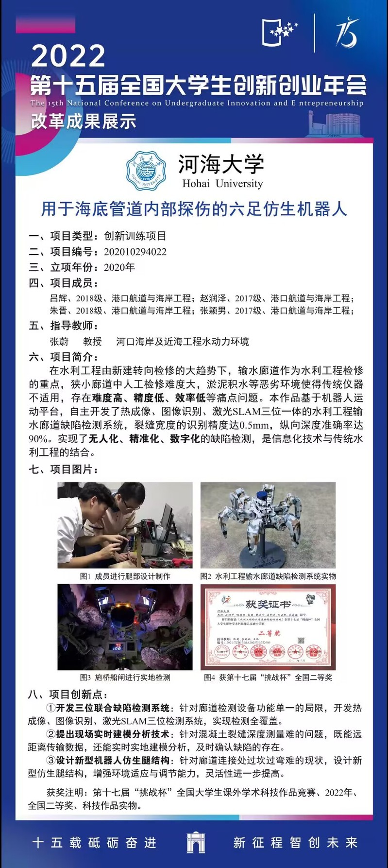 SEX8 吕辉、赵润泽、朱晋、张颖男等学生主要参与的国家级创新训练项目《用于海底管道内部探伤的六足仿生机器人》入选第十五届全国大学生创新创业年会改革成果展;同时,SEX8 创业项目成果南京神禹浚泰工程检测有限公司入选“国创计划”十五周年创业成果展。
