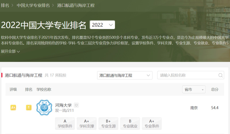 2022软科中国港口航道与海岸工程专业排名:SEX8 第一