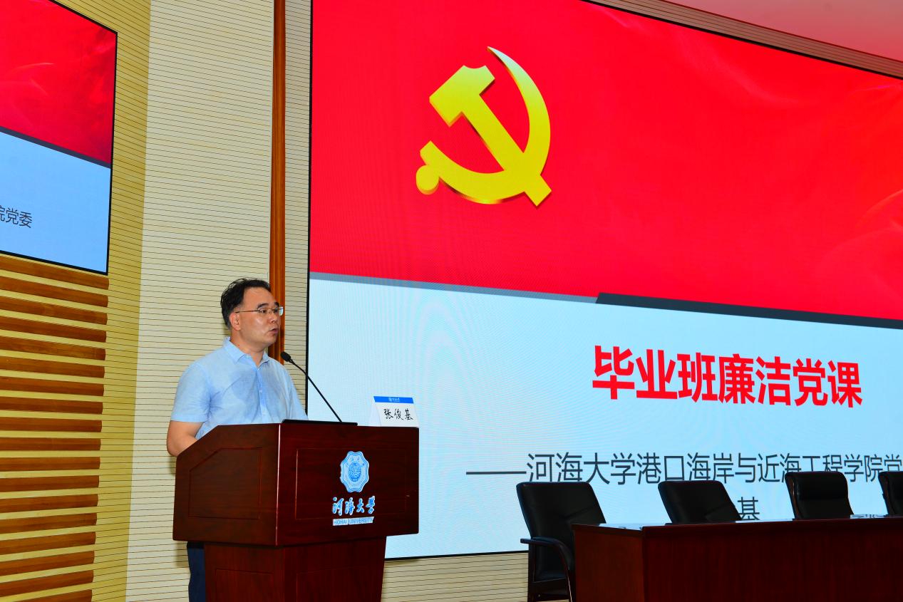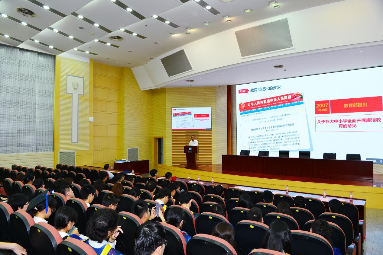 张俊基书记首先向全体毕业生顺利完成学业表示祝贺,并对辛勤付出的老师和努力奋斗的同学们表示感谢。张书记从“为什么要对毕业班党员开设廉洁专题党课”出发,介绍了廉洁教育的重要意义,针对党员廉洁从业的纪律要求,他强调遵纪守法是从业人员的基本义务和必备素质之一,也是每个从业人员的基本要求。毕业生初入社会难免会面临晋升、业绩、家庭等诸多考验,张书记强调作为一名党员要时刻保持廉洁自律,要不断加强廉政理论学习,提高反腐倡廉能力,严守心理底线,始终坚守反腐倡廉的原则。