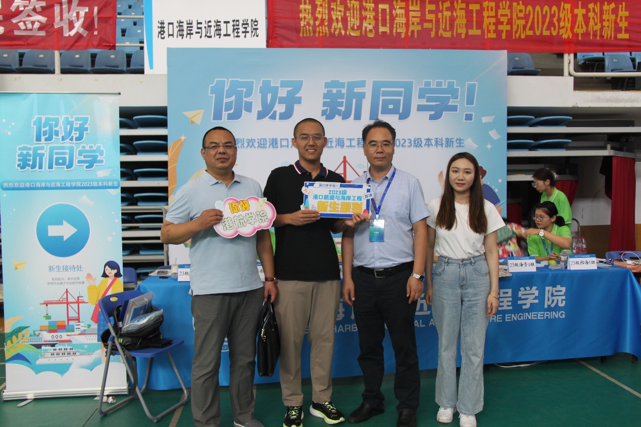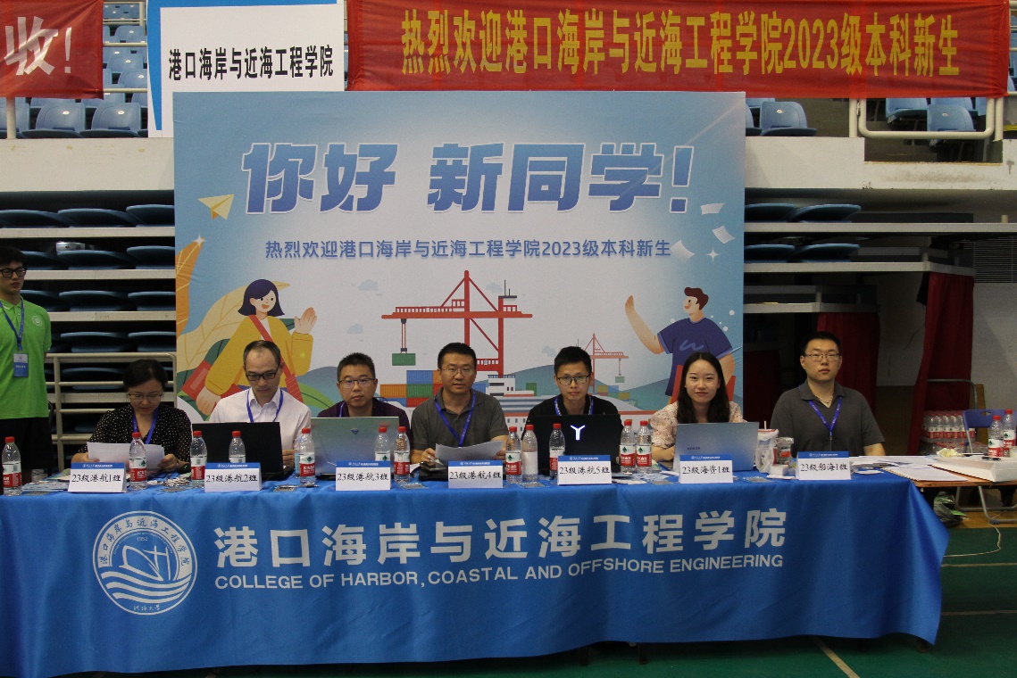文体中心报到处,2023级本科辅导员、班导师、助学导师仔细核对信息,检查材料,为新生办理报到手续。新生们在办理完报到手续后,纷纷在合影点拍照留念,留下自己在河海港航的第一张照片。