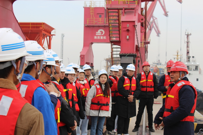 随后,港航院师生前往射阳港区现场参观学习。项目部莫志芳总工程师为同学们介绍了高桩码头的施工与建设情况,就现场的码头吊机、海上浮标、海岸防护堤进行专业认知教育,着重介绍了绞吸船、抓斗船与耙吸船三类疏浚船的工作原理与优缺点,使同学们初步认识了疏浚工程现场。