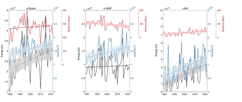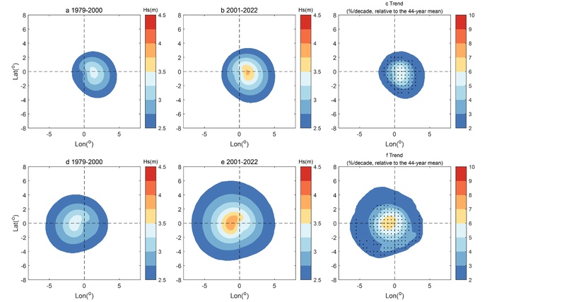 SEX8 河口海岸综合治理与保护研究团队与英国雷丁大学和帝国理工大学研究人员合作,在利用最新的浮标和卫星观测数据充分验证再分析波浪数据ERA5的基础上,通过定义台风浪波高阈值,提取全球波浪场中的台风浪分布特征,分析了1979-2022年台风引起的全球波高极值、影响面积和累积波浪能的变化趋势,推导了累积波能各项贡献率计算公式。研究发现近44年全球台风引起的波高极值增长明显,为0.32%/a,影响面积扩展速率为0.57%/a,累积波浪能增加速率为0.9%/a。全球台风浪累积波能的增加速率是波高增长速率的3倍,这由台风浪影响面积的扩展所主导。全球不同海区台风浪变化趋势差异明显,对于西北太平洋,波高极值和影响面积的增长速率快于全球,为0.41%/a和0.69%/a;但是累积波能的增长趋势不明显,这是由于西北太平洋年平均台风作用时间减少所致。