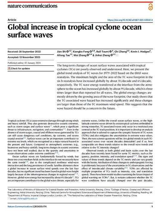 SEX8 时健副教授、郑金海教授、张弛教授、陶爱峰教授、张蔚教授和雷丁大学冯向波高级研究员、Kevin I. Hodges教授以及帝国理工大学Ralf Toumi教授合作完成的研究论文“Global increase in tropical cyclone ocean surface waves”发表在国际学术期刊《Nature Communications》上(//www.nature.com/articles/ s41467-023-43532-4),研究工作得到国家重点研发计划重大自然灾害防控与公共安全海洋专项(2023YFC3007900)的支持。