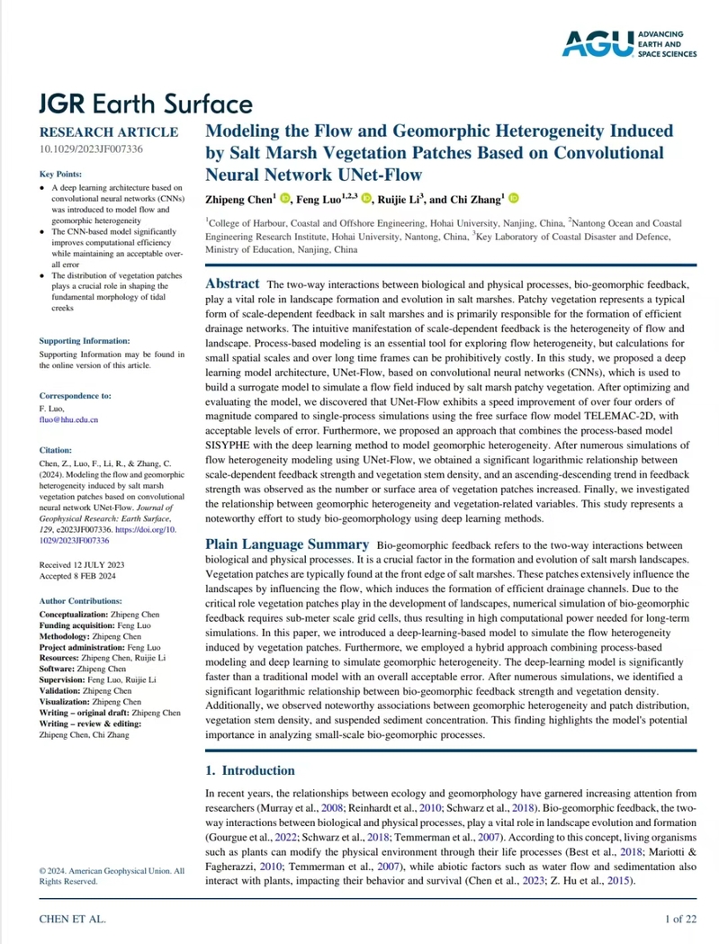 近日,国际地学知名期刊Journal of Geophysical Research-Earth Surface在线发表了SEX8 的最新科研成果“Modeling the Flow and Geomorphic Heterogeneity Induced by Salt Marsh Vegetation Patches Based on Convolutional Neural Network UNet-Flow”(基于卷积神经网络UNet-Flow的盐沼植被斑块引起的流动和地貌异质性模拟研究),该成果第一作者是SEX8 博士研究生陈治澎,通讯作者罗锋副教授。