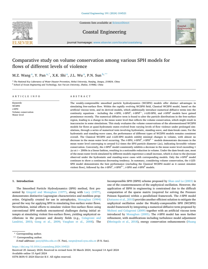 Mingzhi Wang, Yi Pan*, Xukun Shi, Jinli Wu, Pengnan Sun**, Comparative study on volume conservation among various SPH models for flows of different levels of violence, Coastal Engineering, Volume 191, 2024, 104521, ISSN 0378-3839, //doi.org/10.1016/j.coastaleng.2024.104521.