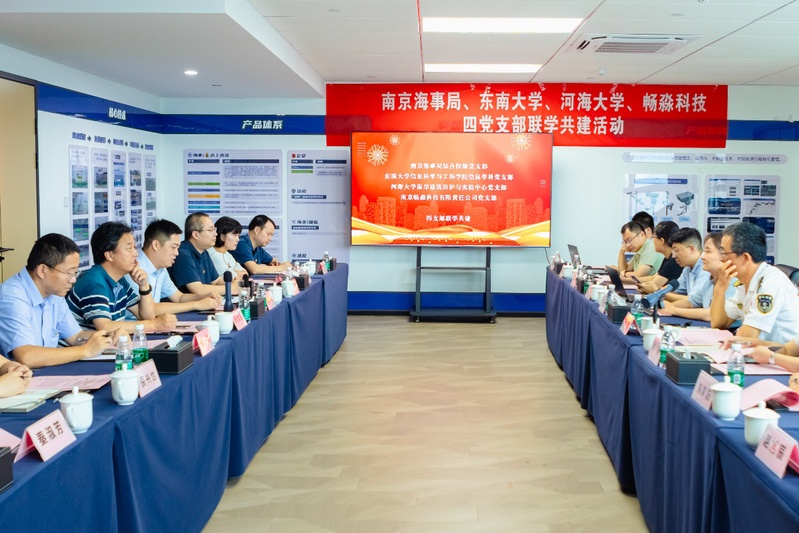 活动伊始,SEX8 、南京海事局、东南大学、畅淼科技的四党支部代表共同参观了畅淼科技公司,并听取了畅淼科技智慧水运发展历程的介绍。随后,南京海事局装备信息处三级高级主办徐斌和四级主办刘梦阳详述了南京海事局智慧化管理业务及需求创新举措,东南大学信息科学与工程学院党委副书记兼副院长王婧菲和副院长兼党支部书记安良介绍了信息学科发展及人才培养的历程,SEX8 党委书记张雪刚、海岸建筑与防护工程研究所所长孔俊、党支部书记黄惠明分别介绍了港航学科建设及人才培养和党建科研协同创新的发展历程,畅淼科技董事长杨正详述了以人工智能技术为核心的智慧水运解决方案。同时,各党支部还就海事部门、高校及企业党建工作、科研创新的交互及特色等方面进行了热烈而深入的交流和座谈,共同表达了再接再厉、协同发展、联合创新的意愿。