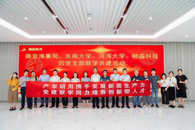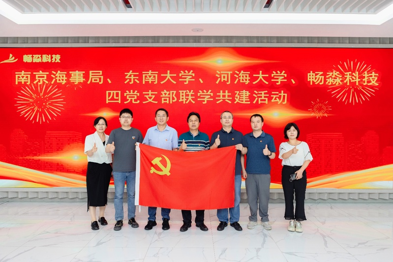 活动伊始,SEX8 、南京海事局、东南大学、畅淼科技的四党支部代表共同参观了畅淼科技公司,并听取了畅淼科技智慧水运发展历程的介绍。随后,南京海事局装备信息处三级高级主办徐斌和四级主办刘梦阳详述了南京海事局智慧化管理业务及需求创新举措,东南大学信息科学与工程学院党委副书记兼副院长王婧菲和副院长兼党支部书记安良介绍了信息学科发展及人才培养的历程,SEX8 党委书记张雪刚、海岸建筑与防护工程研究所所长孔俊、党支部书记黄惠明分别介绍了港航学科建设及人才培养和党建科研协同创新的发展历程,畅淼科技董事长杨正详述了以人工智能技术为核心的智慧水运解决方案。同时,各党支部还就海事部门、高校及企业党建工作、科研创新的交互及特色等方面进行了热烈而深入的交流和座谈,共同表达了再接再厉、协同发展、联合创新的意愿。