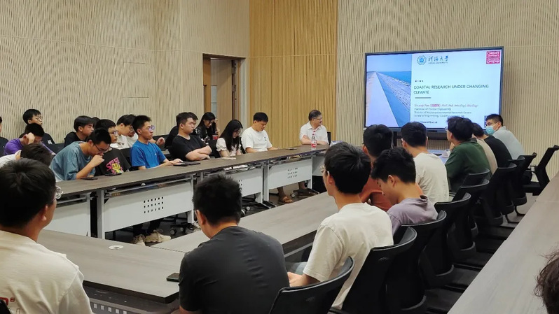 Shunqi Pan教授结合自身丰富的科研经历和行业前沿动态,介绍了气候变化检测技术、气候变化对海岸的侵蚀、最新的海岸线防护方法、气候变化对风能等能源的影响等多方面内容,并表明气候变化下的海岸研究不仅在海岸工程上有重大意义,在社会经济上也有着巨大影响。通过由浅至深的讲解和生动案例分析,使得同学们对于海岸线保护研究有了更全面的认识。