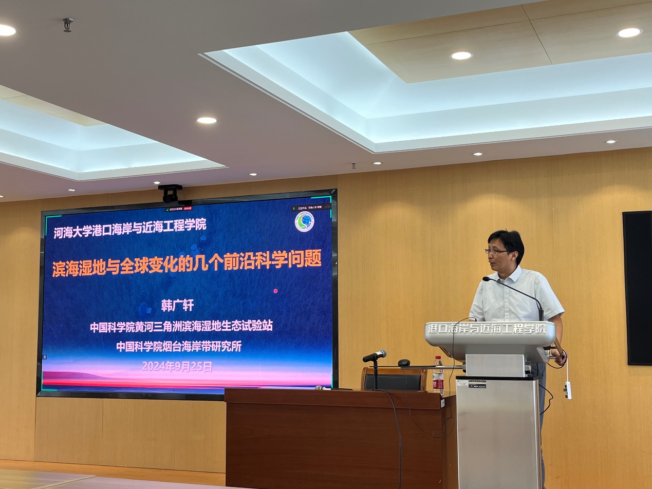 2024年9月25日,中国科学院烟台海岸带研究所副所长韩广轩研究员应江苏省海岸海洋资源开发与环境安全重点实验室邀请,在严恺馆702报告厅作了题为“滨海湿地与全球变化的几个前沿科学问题”的学术报告。学术报告会由周曾教授主持。
