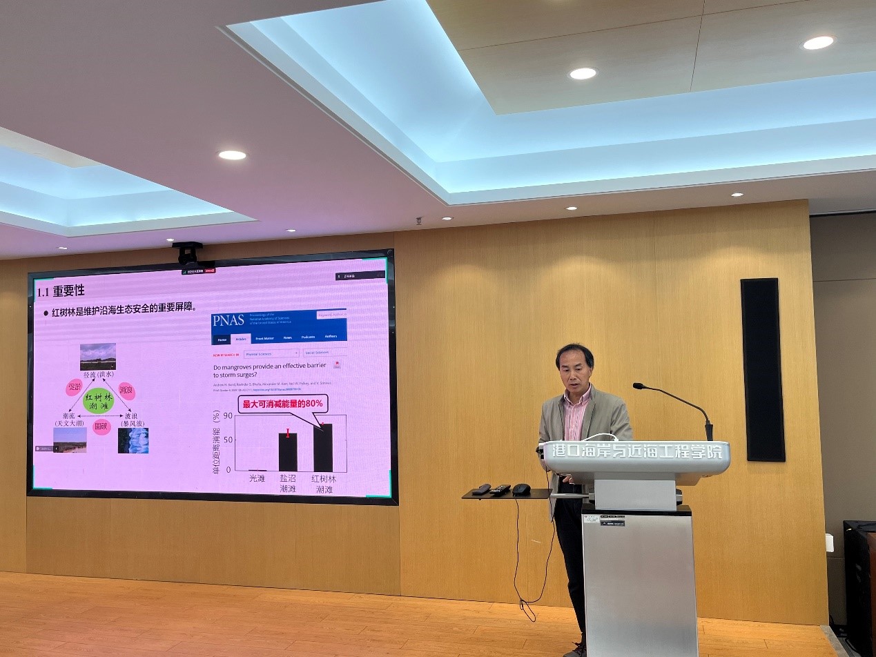 戴志军研究员介绍了广西红树林区的侵蚀现状和红树林人工定植修复工程。“一年生、二年死、三年死光光”描述了红树林成活率极低的现状。通过对不同省份数十个人工定植红树林区域的长期观测,戴志军研究员领衔的研究团队发现红树林根系受到损害是成活率低的主要原因之一,进而提出了本地红树林胚胎大钵育苗、根系无损移植、聚集定植的营林模式,以及可抵御波流联合作用影响的胚胎-幼苗栽培模式,以具体案例的形式介绍了系列成果在我国多处生态修复工程的转化应用。