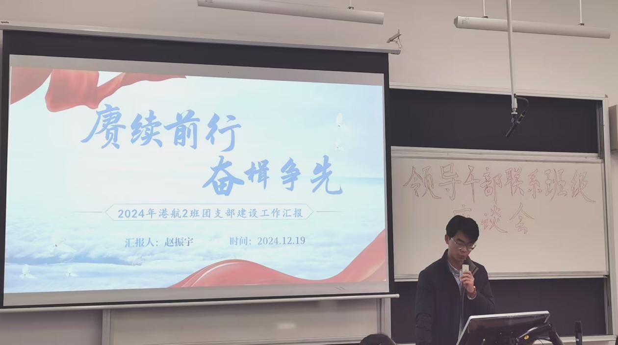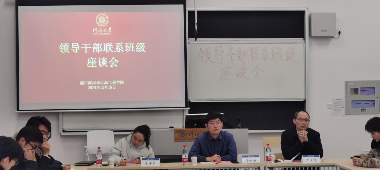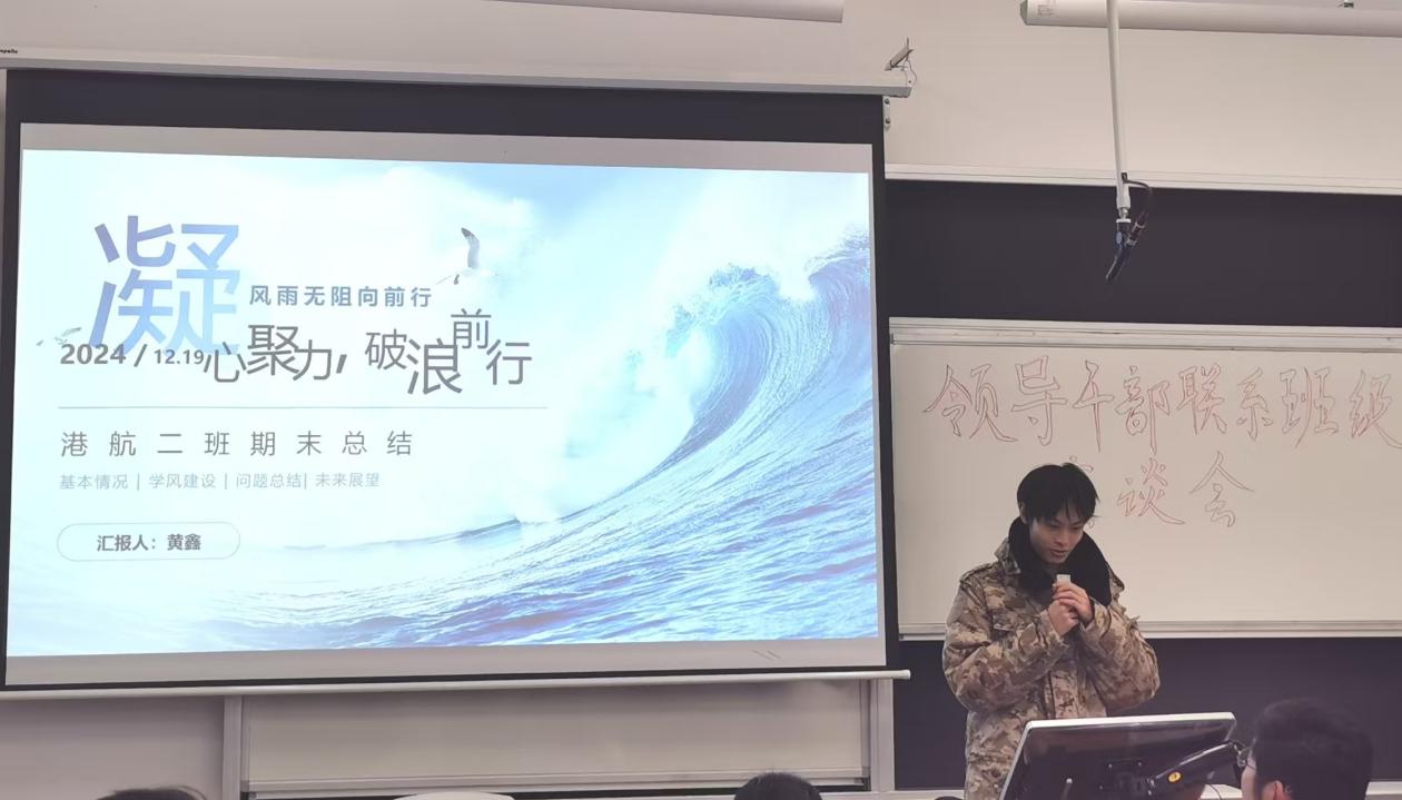 12月19日下午,SEX8 组织领导干部联系班级座谈会,学院副院长管大为、班导师严士常、辅导员廖芳艺、23级港航二班全体同学参加本次座谈会,赵振宇同学主持。