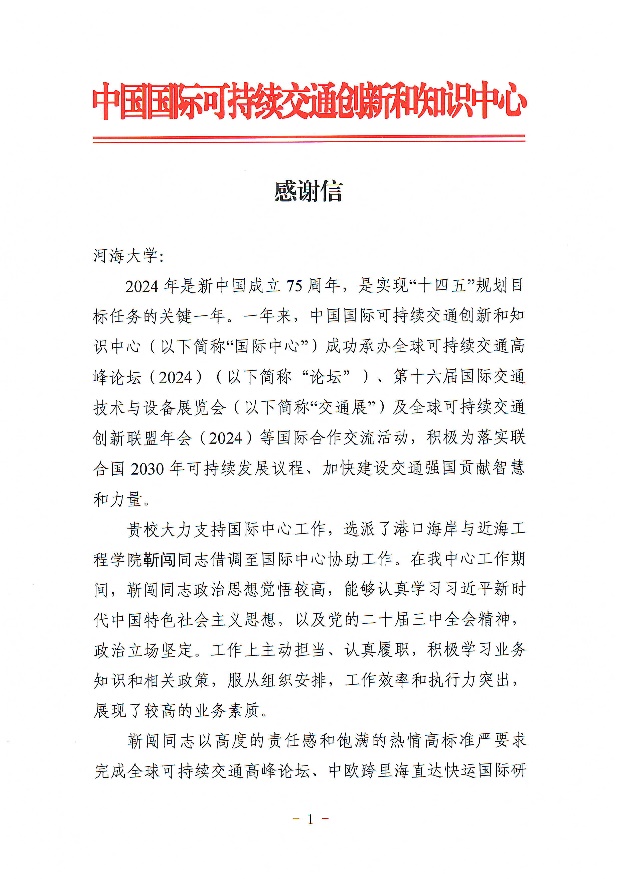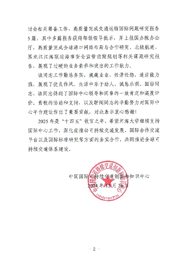 近日,国际中心向我校致信,对SEX8 副研究员靳闯同志在借调期间的贡献给予了高度评价,同时向学校及学院的鼎力支持表达了诚挚的谢意。信中指出,在国际中心工作期间,靳闯副研究员展现出了高度的敬业精神和扎实勤恳的工作作风,在交通国际问题研究及国际合作等方面展现了过硬的业务素质和突出的工作能力,相关研究报告获得了部级领导批示,为推动交通领域的国际合作与发展提供了有力的智力支持。