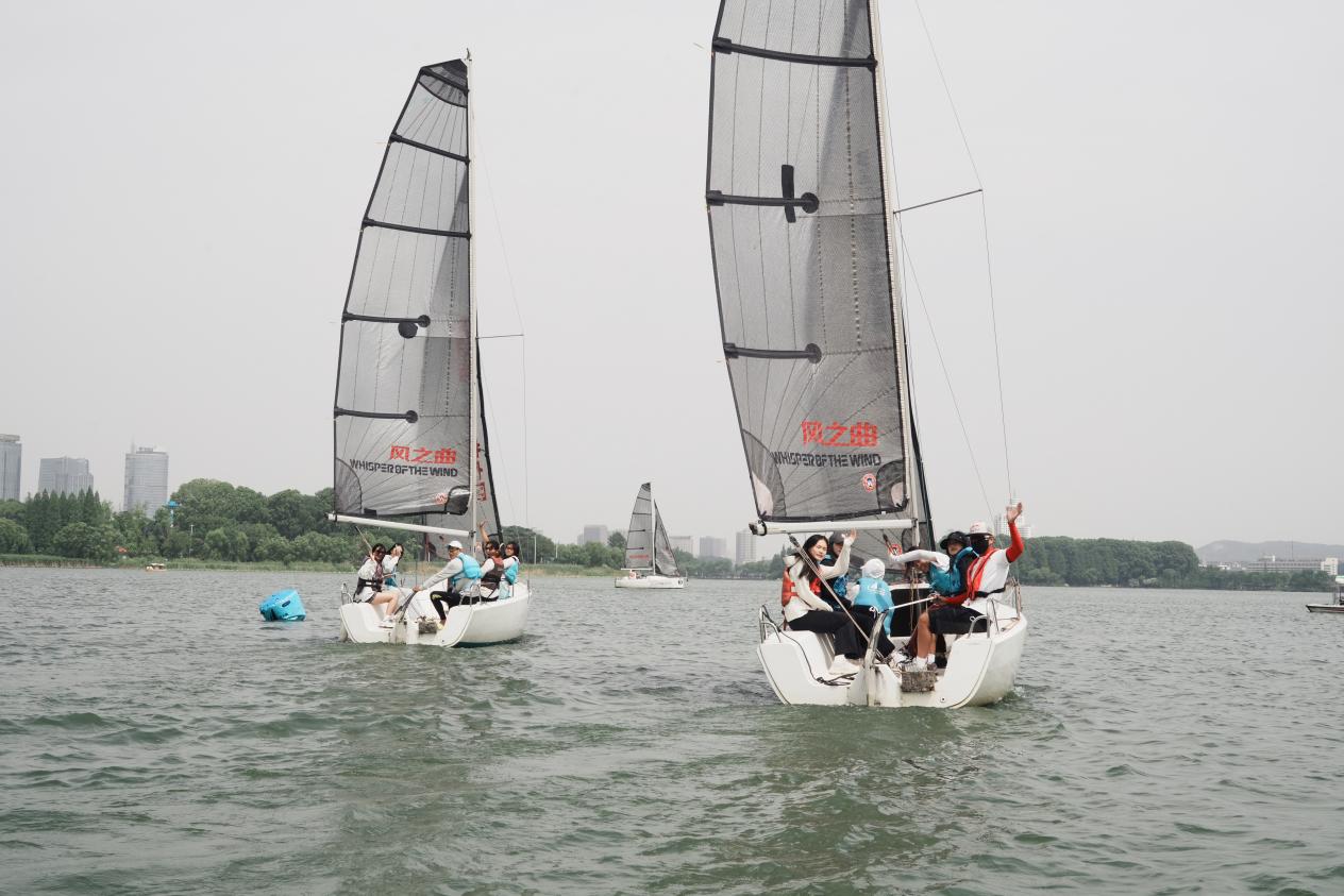 在体验帆船航行中,教练引导同学们使用绳子对帆进行控制,在转向时替换两侧的帆绳以能控制方向,并且教练利用娴熟的技能带领同学们进行压弯操作,为本就有趣的航行增添欢乐与刺激。同学们在湖风吹拂中,感受扬帆启航的动力与冲劲,坚定了把握机遇、勇担重任、不懈奋斗的精神。