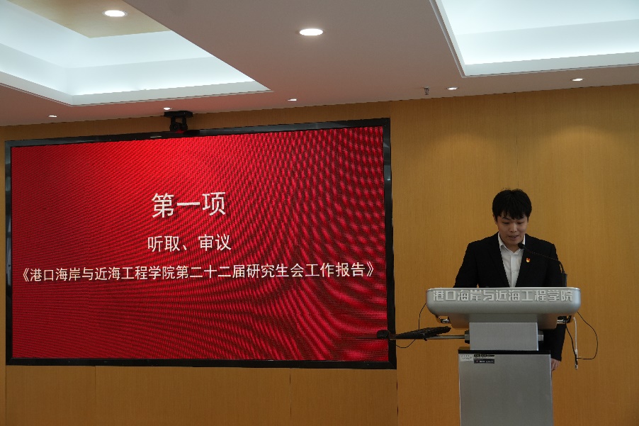 受第二十二届研究生会的委托,港航院研究生会主席团成员王亚辰同学向大会作了题为《笃行致远担使命 砥砺奋进向未来》的研究生会工作报告,分别从思想精神引领、学术氛围营造、志愿服务组织、新媒体平台建设等方面阐述了过去一学年研究生会工作的开展情况,同时表达了对下一届研究生会主席团工作的展望和祝福。此外,王亚辰同学代表研究生会宣读了《SEX8 研究生会章程(修正案)》。全体代表听取并审议通过工作报告与研究生会章程。