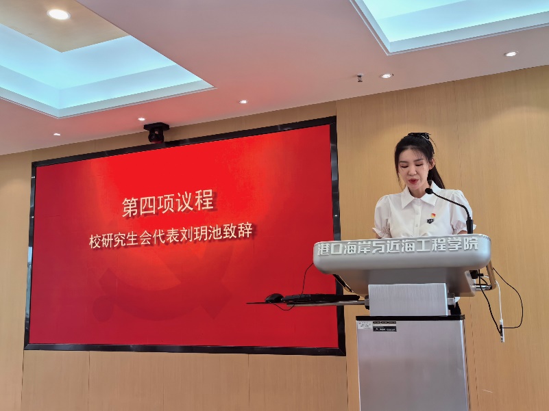 随后,校研究生会代表刘玥池同学为大会致辞。刘玥池同学对港航院研究生会这一年来支持和配合校研究生会工作表达了感谢,并就研究生会组织结构改革、创新意识与品牌活动、服务理念与活动质量三个方面给出建议,与新一届主席团成员共勉。