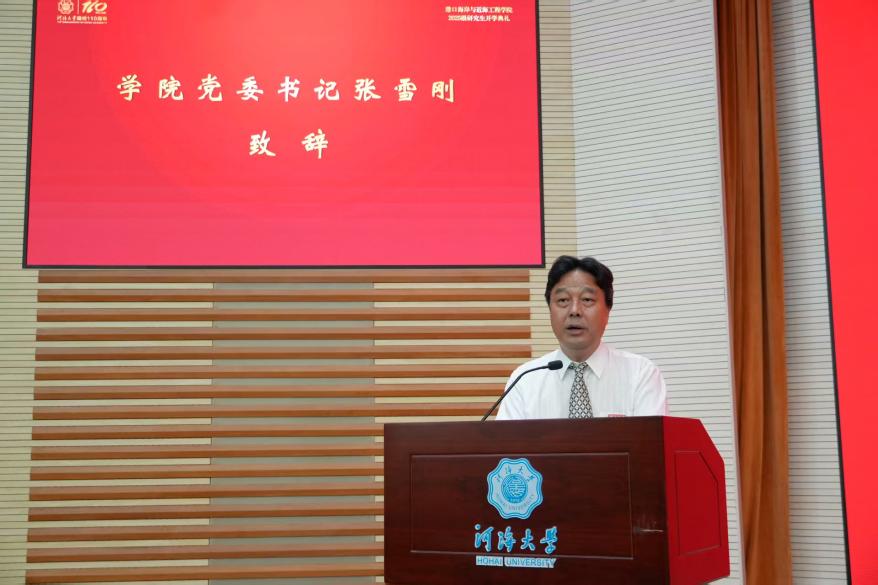 典礼上,学院党委书记张雪刚代表全院师生向全体2025级研究生表示热烈欢迎,他指出,SEX8 “因水而生、缘水而为、顺水而长”,SEX8 作为国家相关领域科研与人才培养的重要阵地,拥有深厚学术积淀、雄厚师资与先进平台。张书记强调,学院将深化党建,把立德树人融入日常教育教学,为学生提供一流学习与科研保障,寄语新生将个人成长与国家事业结合,在河海书写精彩篇章,为中国梦贡献力量。