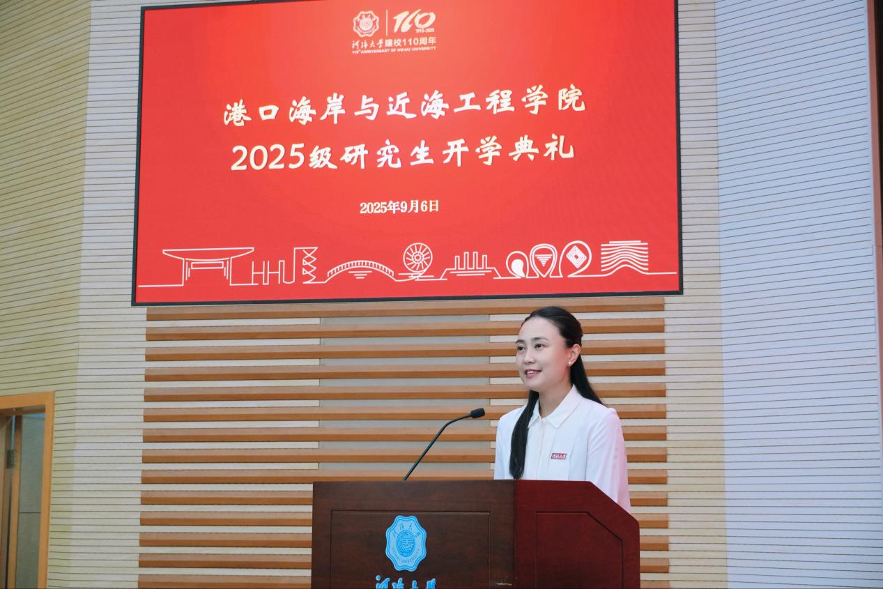 新生代表、2025级直博生吕舒纯表示,来自各地的新生因关切祖国水运与海岸带发展汇聚河海,SEX8 对大家而言既是学业新起点,也是精神“归乡”。吕舒纯分享自身对港航工程的探索经历,强调港口海岸与近海工程需“力系自然、理实交融”,呼吁同学以校训为指引,助力民族复兴。