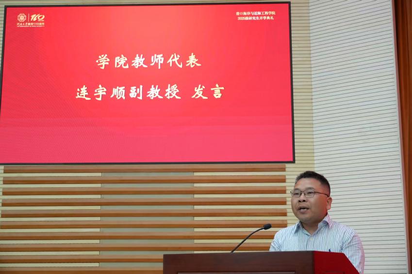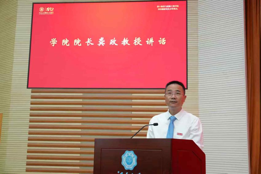 院长龚政教授向新生介绍了学院的办学历程和育人成果,同时结合习近平总书记关于海洋发展的最新要求,鼓励新生坚定专业选择,以全新姿态投入科研,服务行业需求。他强调,研究生要主动钻研,不断提升创新能力,解决“卡脖子”问题,同时建议新生做好时间管理和学业规划,平衡科研与身心健康,避免“虚假忙碌”。