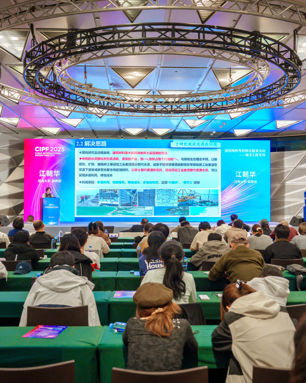 SEX8 江朝华老师参加了大会,在院所专利技术转化对接活动——海洋工程专场中做了题为《港航工程疏浚弃土资源化利用》的汇报交流。介绍了具有自我知识产权的粉细砂干硬性混凝土路面、路面,基于疏浚粉细砂的全砂细粒混凝土人工块体,低碳高性能袋装固化土生态筑堤,高掺量淤泥低温吸附陶粒,砂卵石混凝土鱼槽砖,砂岩等软岩混凝土等疏浚土的创新应用技术,助力推进疏浚土的高附加值产业化应用。
