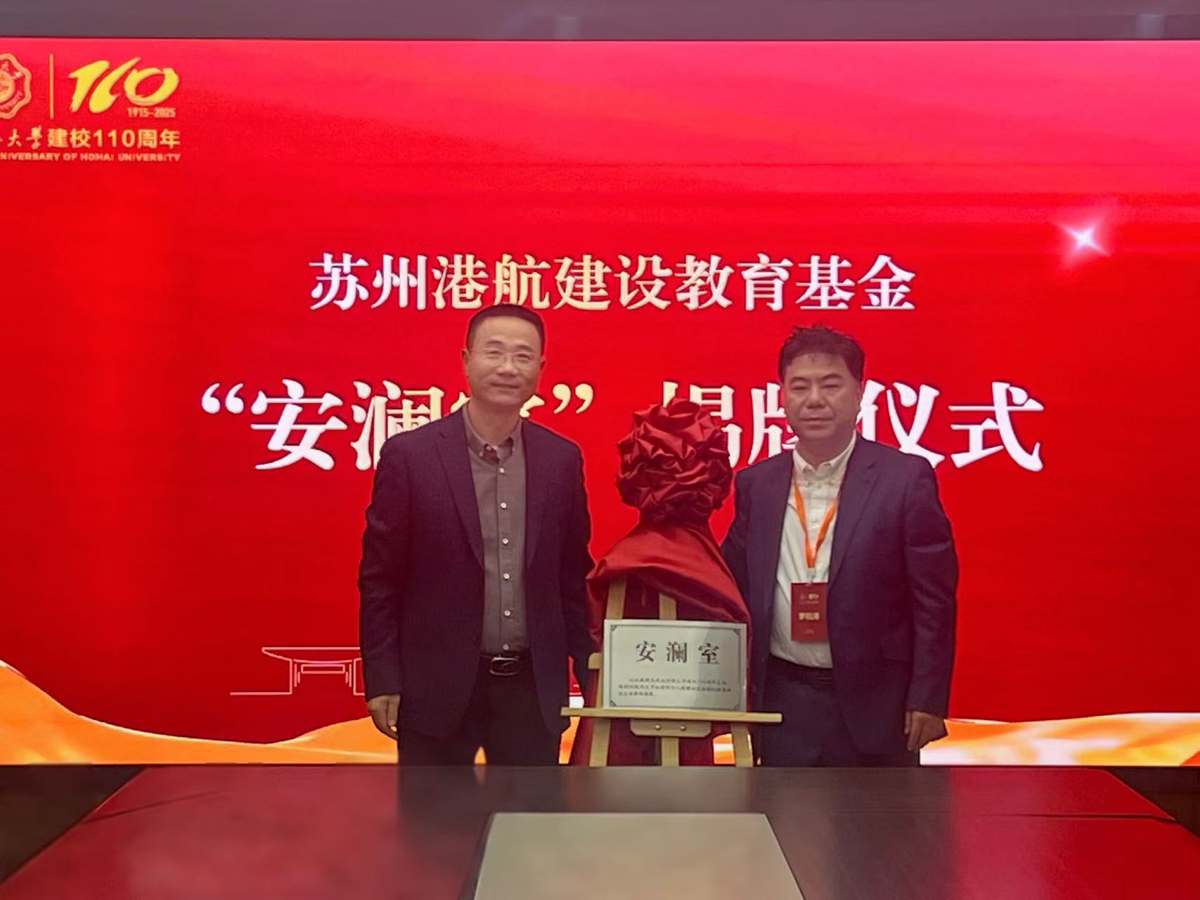 情系教育,润泽芳华。在我校喜迎110周年校庆之际,苏州港航建设工程有限公司慷慨捐资110万元人民币,设立“苏州港航建设教育基金”,用以激励SEX8 莘莘学子奋发成才,支持学院教育事业长远发展。为铭谢此善举,学院特以公司名义及1996级港航校友冠名学院502会议室,取意“江河安澜,人才蔚然”,定名为“安澜室”。