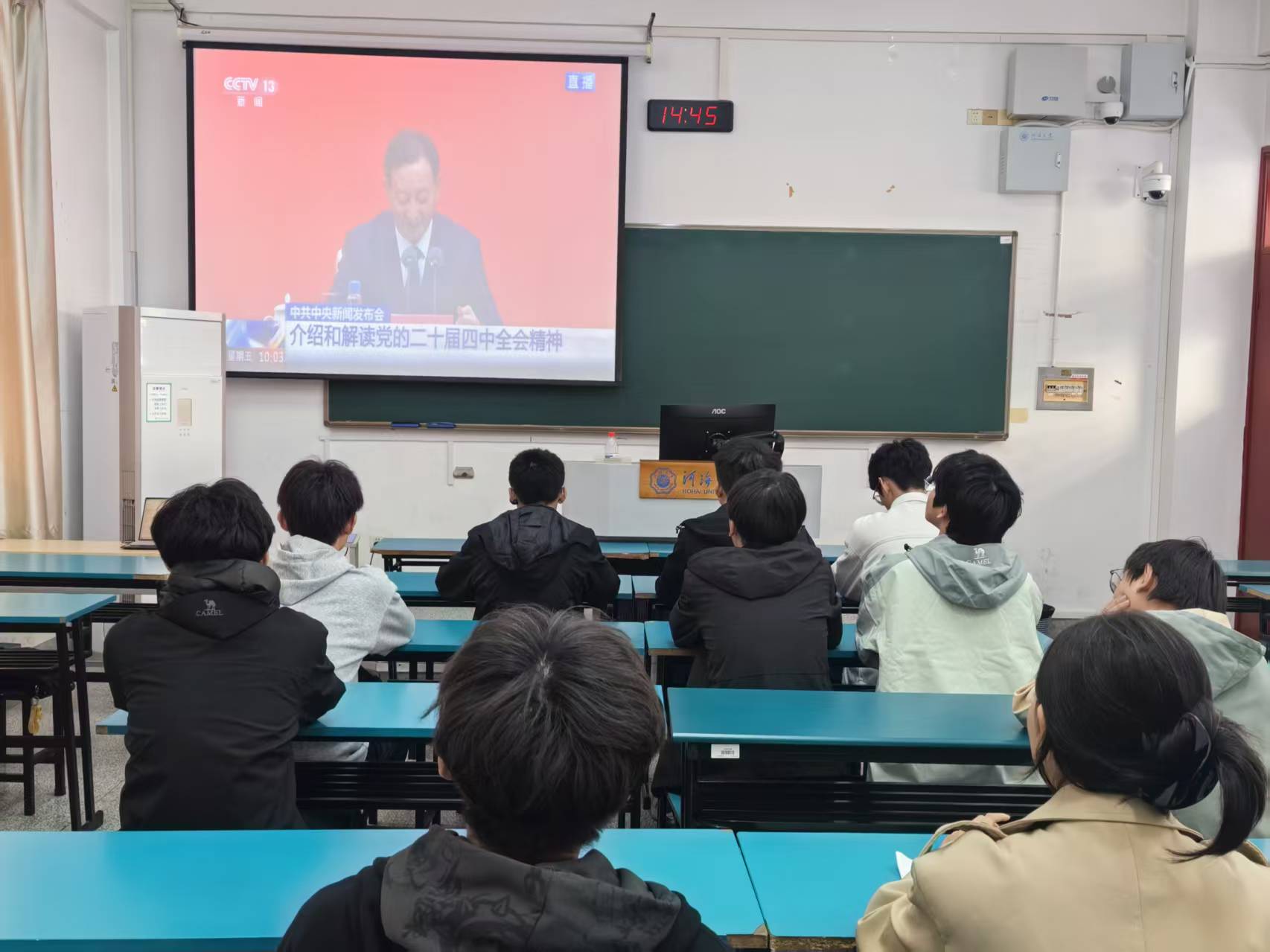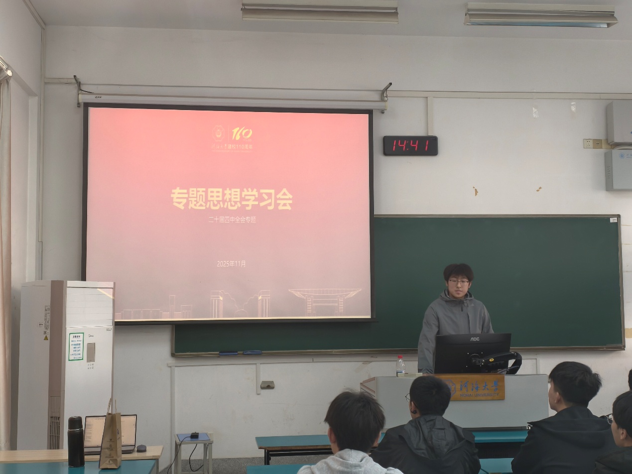 会议第二部分,组织学习党的二十届四中全会精神。主持人首先对全会基本信息作了介绍,指出我党凝聚同心,绘制未来蓝图,此次全会起到承上启下的重要作用,同时会议总结了推进中国式现代化的六个“坚持”。随后,全体同学观看了党的二十届四中全会相关视频,更加深入地了解了此次全会的重要意义和深远影响。