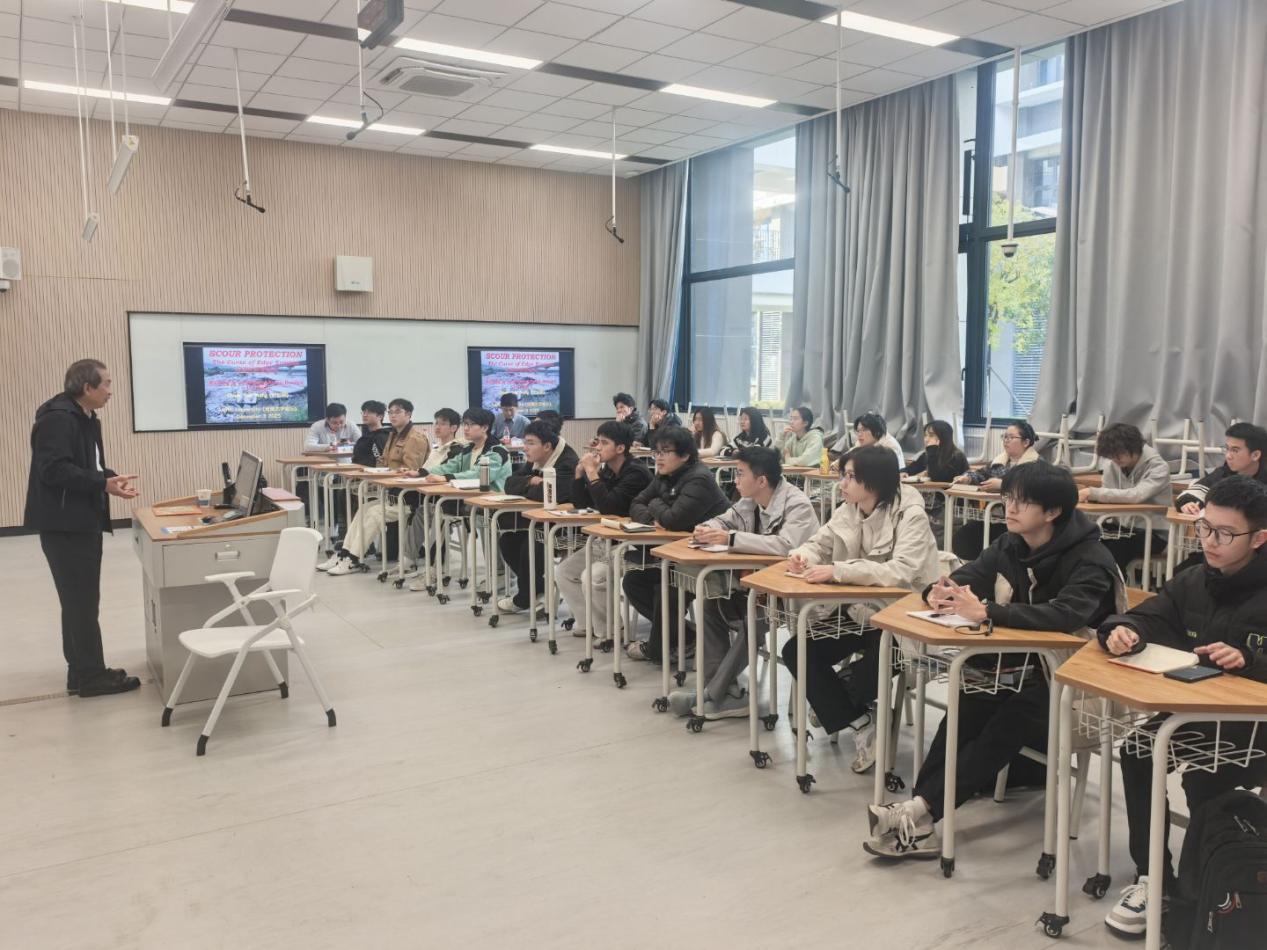 Chiew Yee Meng教授讲授了题为《SCOUR PROTECTION - The Curse of Edge Erosion》的讲座,通过对台湾省后丰大桥在台风引发的洪水中倒塌等具体案例分析,系统阐述了跨海大桥等工程结构基础冲刷防治的科学原理。