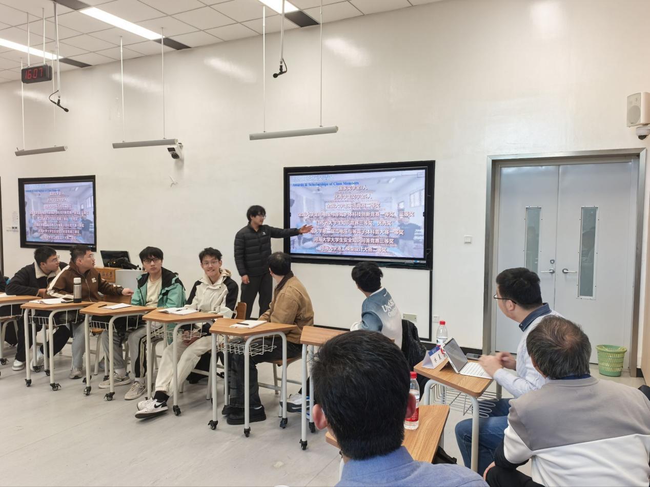 班长韦金泽汇报了班级建设情况,从班级概况、学生获奖、班级活动、专业认知工作等方面,分享了班级同学认真学习、参加学科竞赛、担任学生骨干、参与校园文体活动的优异表现,充分展现了班级建设的良好氛围。
